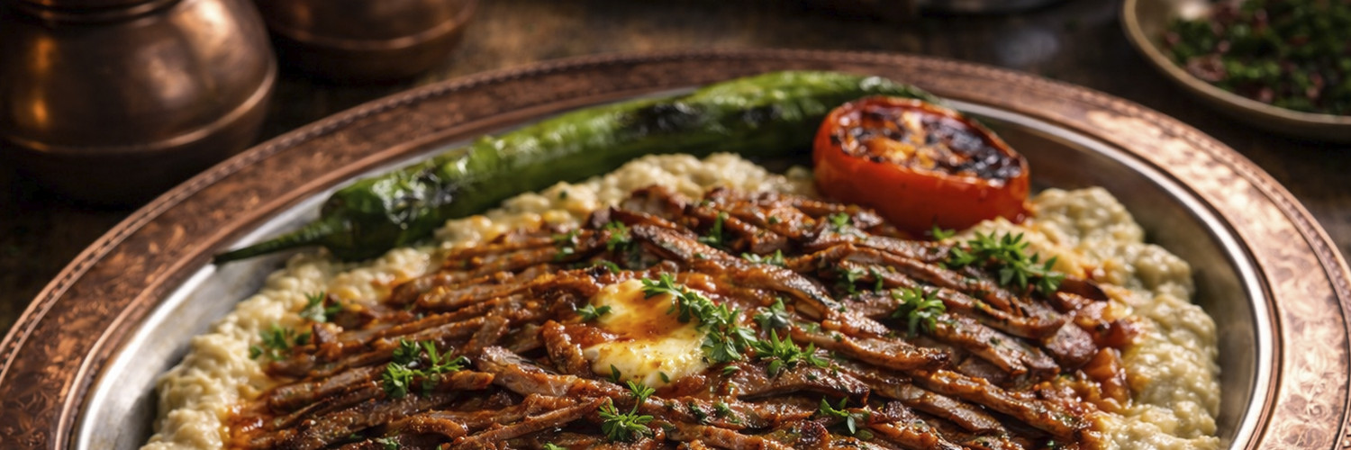 Een koninklijk gerecht uit de Ottomaanse keuken waarbij hartige döner wordt gecombineerd met een romige auberginepuree. De zachte kaasachtige Beğendi-basis vormt een perfect contrast met de krokant gebakken reepjes döner.